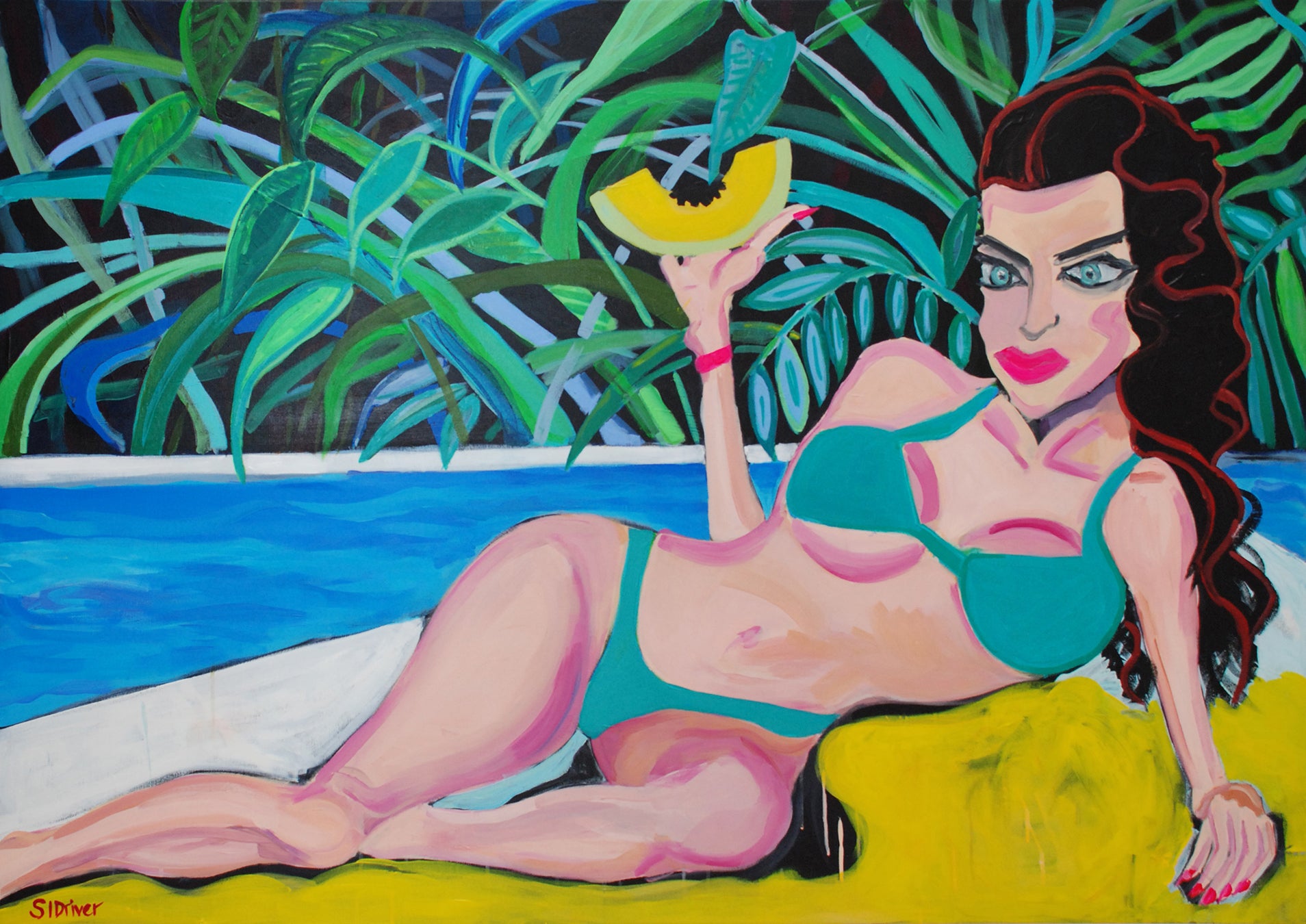 Draped across sun-drenched yellow with a turquoise bikini and a slice of melon like a crown, the woman in Love Me Honey, I’m Consumable knows exactly how she’s being viewed, and she’s turning that gaze into a performance. Camp, glossy, and utterly deliberate, she doesn’t just pose - she dares you to underestimate her. Pure theatre. She’s a femme fatale in holiday mode, and the fruit is more than a snack.